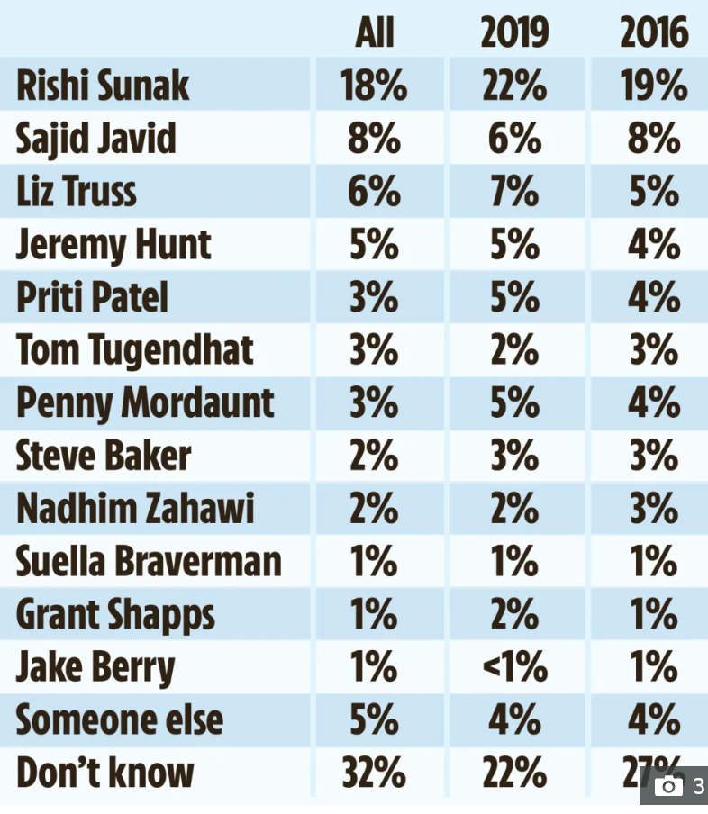 Don't know is the clear winner. As long as Don't Know is not a war-monger prepared to send Britain into economic and military oblivion against Russia (and China and India who are now being described as the new axis of evil forces - you are either against Russia or you are against us rhetoric) and stops sending UK taxpayers billions to Britain's Weapons Industries (with the political classes getting kick backs) to modernize and replace Britain's old Military Equipment while sending all the old military equipment to Ukraine to be sold on the black market, then I will be giving my vote to Don't Know.