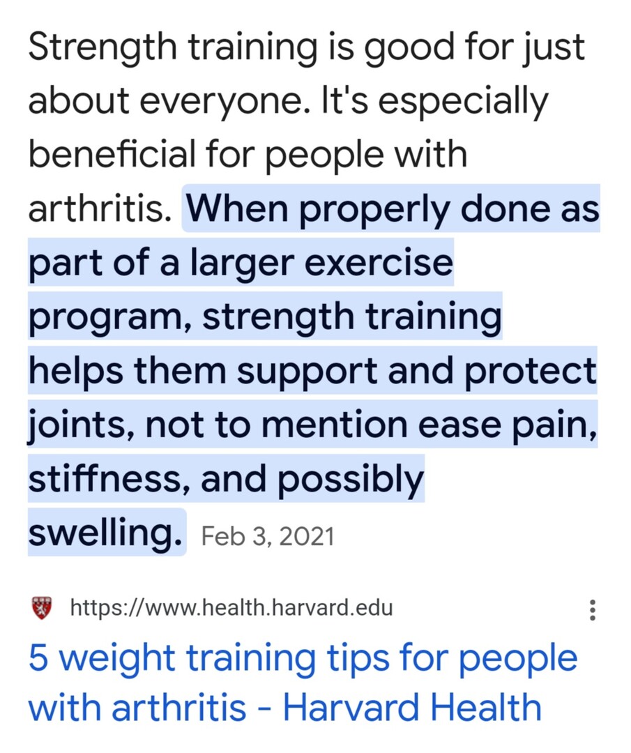 You keep trying to push the idea of heavy weight lifting, when other forms of more gentle exercise are probably better for conditions like arthritis. Tai Chi for instance is effective and doesn't involve straining.