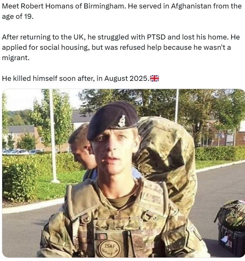 I doubt the rhetoric that he was refused housing because he's not a migrant is entirely true, however, it's a bloody disgrace that he wasn't looked after and given accommodation of which there would be more available if there were less illegals. if they can house illegals in hotels and HMO's then they can do the same for our vets.