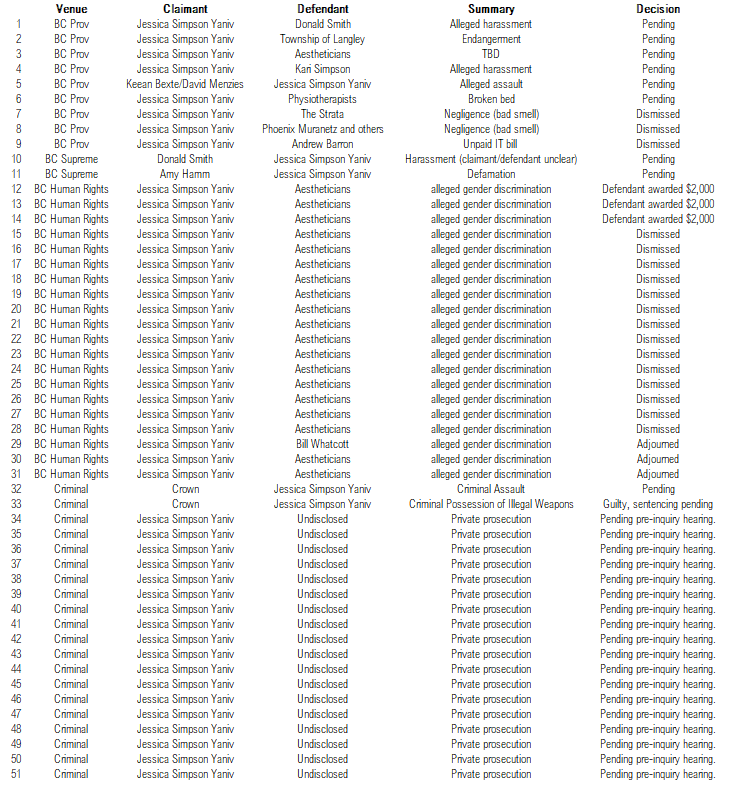 A list of the prosecutions Jonathan 'Jessica' Yaniv has brought against people.