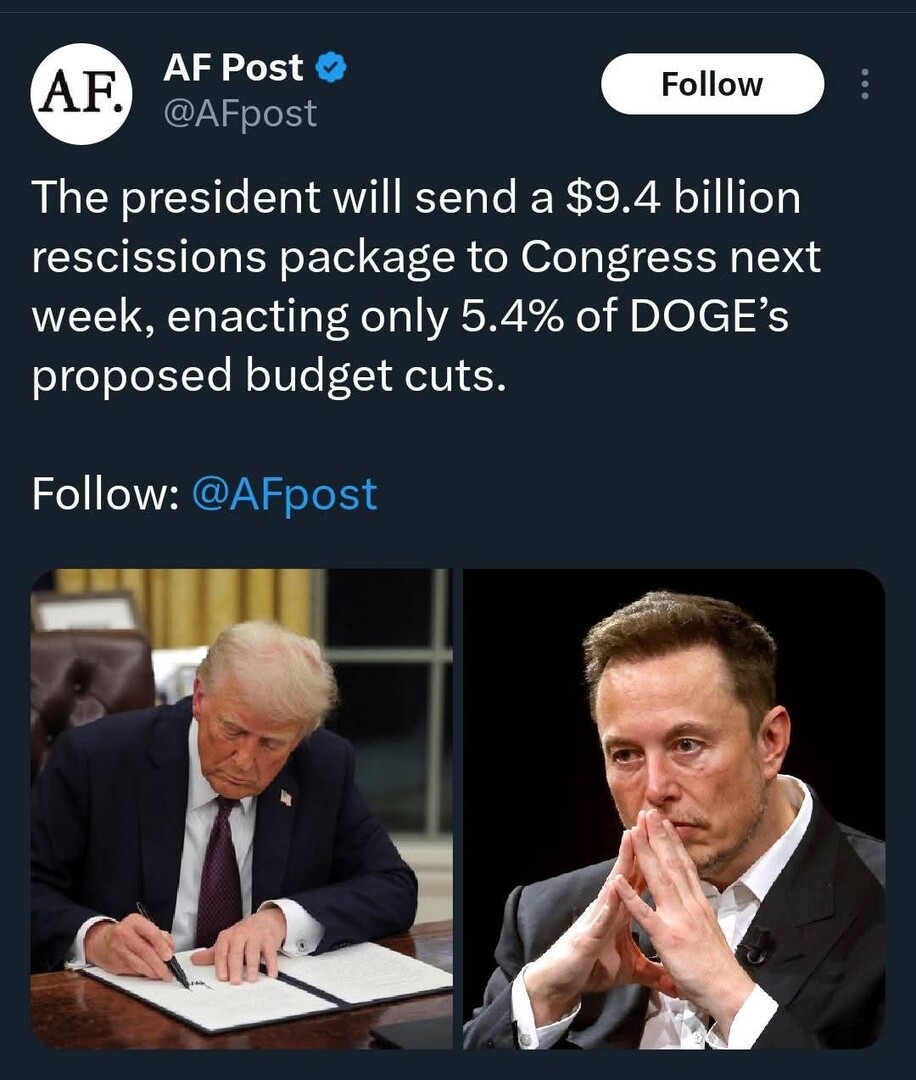 That said I don't know why Elon is whining so much on Twitter. He was given unprecedented access to identify cuts and had significant resources to do so and completely failed. He went after small ticket items like DEI programs and agencies he didn't like such as USAID which comes across more like petty grievances rather than any serious effort to tackle the deficit. Estimates of cuts fell from $2T to $1T and then $190bn and now it looks like he will be lucky to have achieved $9bn. He torched his reputation and value of Tesla in the process. He has no one to blame other than himself for that clown show.Ā