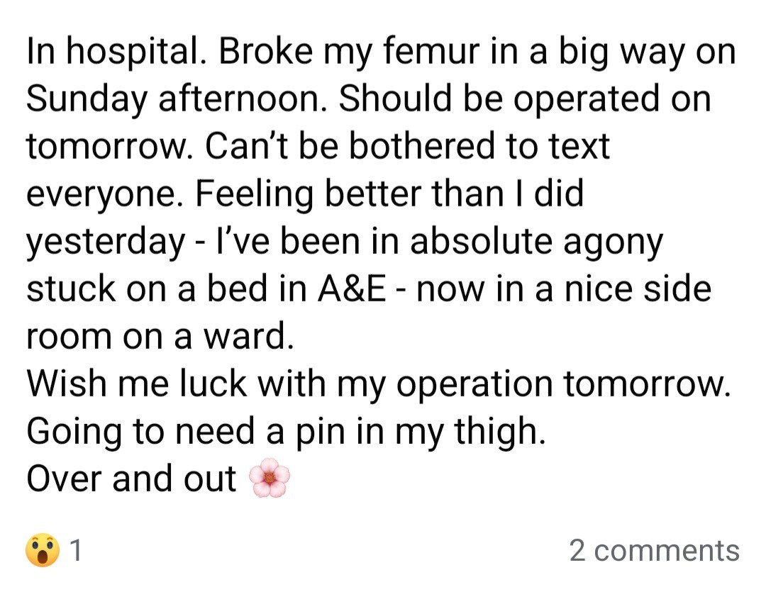 Still waiting to hear how she did it. She has a metal rod and screws and was in the hospital for about 4 days, so she did a good job on her leg, however she did it..🤷♂️