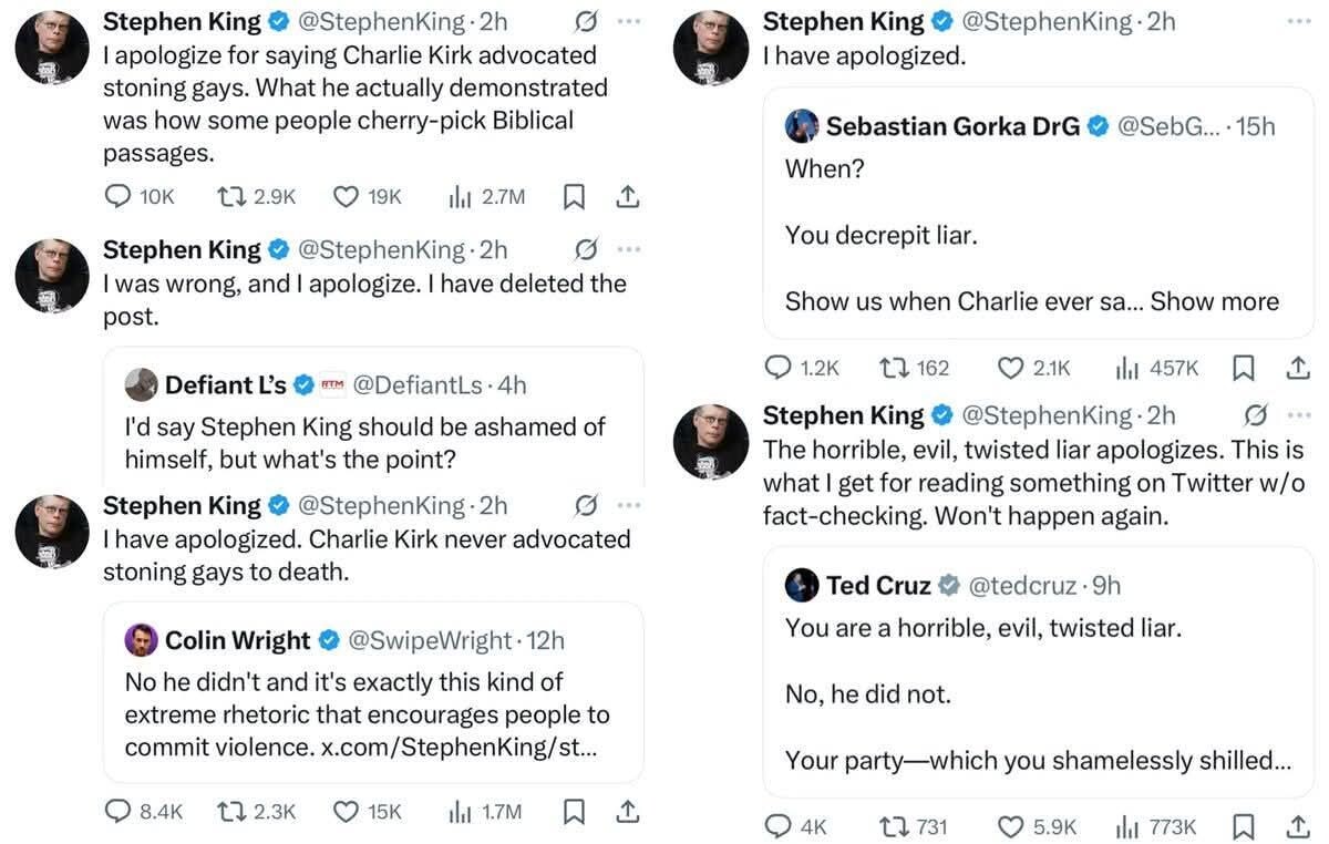 After backlash from Kirk supporters, the author Stephen King, who had posted on X on Sept. 11 that Kirk had “advocated stoning gays to death,” retracted his claim and apologized. King said, “What [Kirk] actually demonstrated was how some people cherry-pick Biblical passages.