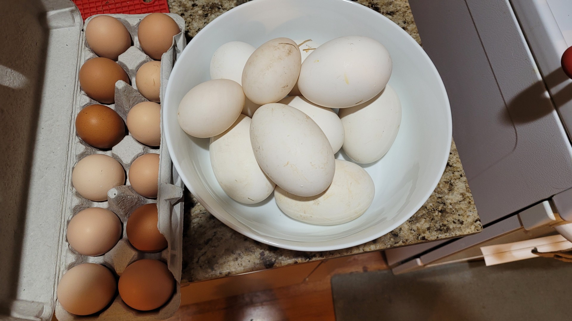 Ever eat a goose egg? It's about 3 times the size of a chicken egg and very rich..