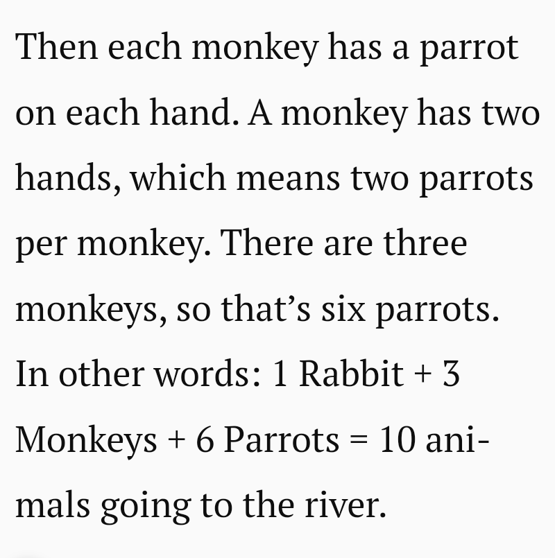 It says the elephants are going to the river, not towards it. Three monkeys are going towards it. So, we have 9 going to it. Three going towards it. Each monkey had a parrot in each hand, that's 6. So nine are going towards the river.