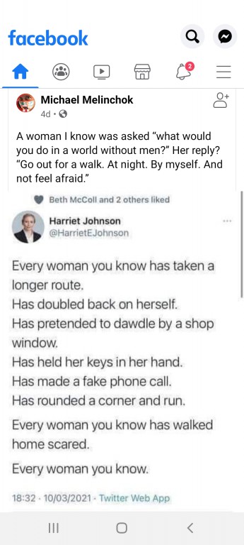 How ridiculous is it for the few men hating minority to be shouting about curfews for men? But it's OK and seemingly acceptable for so many women to have self-imposed curfews inflicted on them because of their fear of being out alone at night.