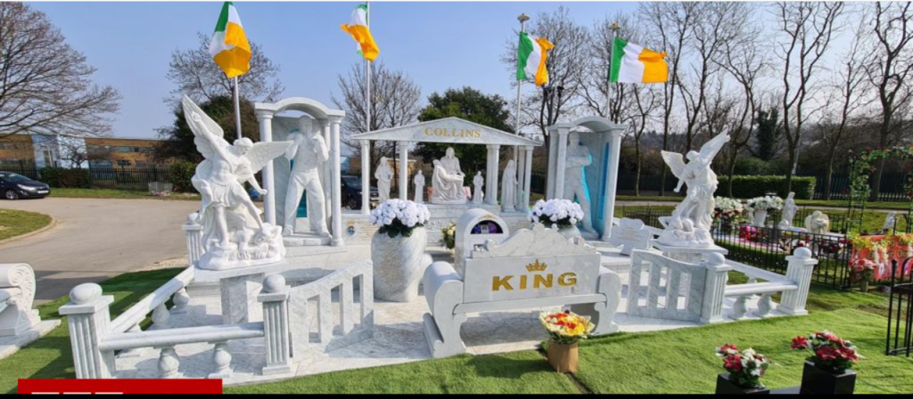Big Willy's headstone has two life size statues of him, disco music, flashing lights, statues of Mary and Four Irish Flags.