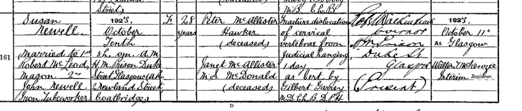 The death certificate of Susan Newell, the last woman hanged in Scotland. She Murdered her paperboy for a few pennies.
