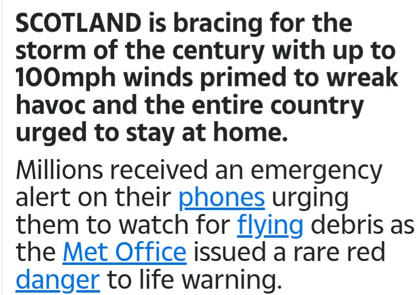 Vita, batten down the hatches. On the BBC news this morning, it reported winds could reach 120mph in parts of Scotland.
