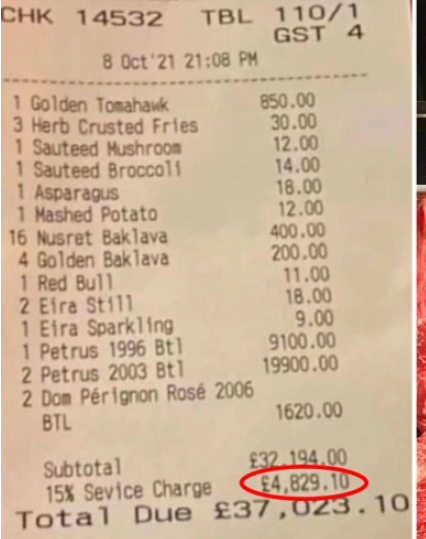 Some eejit with more money than sense was at that flash restaurant in London and they spent more than £32,000 on food then got hit with a Service charge of nearly £5,000!! 😮
