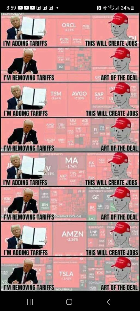 ‘ Theory is that it’s all a deliberate spoof, along the lines of: Tariffs announcement > Stocks plummet > Gazillionaires buy cheap stocks like they’re in Costco on Black Friday > Tariffs get rolled back > Stock market recovers >>> Kerching!’
