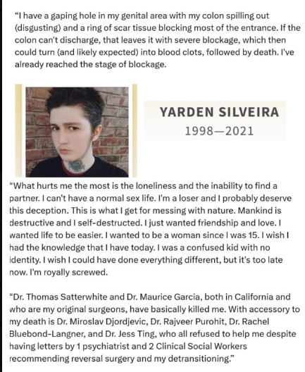 I'm just aghast that so called eminent people went along with what amounts to child abuse. That they got so caught up in the madness of trans ideology and mutilated a whole generation of kids. People being born into the wrong body is not a new thing, I'm sure it's been going on since the beginning of humanity. But it's too easy to go under the knife and mess with nature at your peril.