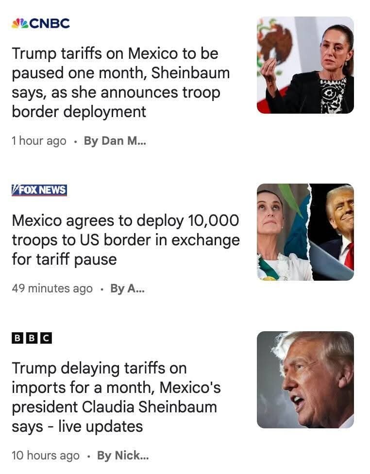 b) The USA has major deficits with Canada, Mexico, and China (and almost all countries!), owes 36 Trillion Dollars, and we’re not going to be the ‘Stupid Country’ any longer” .... this will be the “golden age of America” ... there may be “some pain” felt due to the tariffs but it “will all be worth the price that must be paid.”