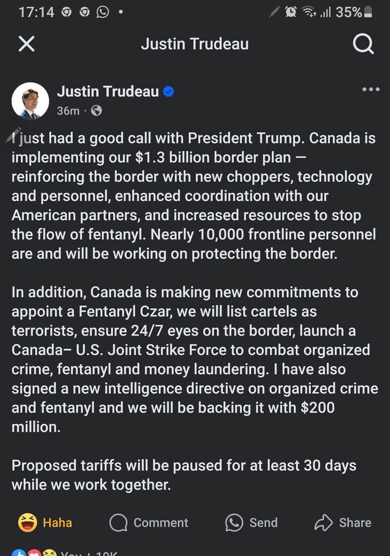 So Trudeau is doing a little more than he promised Biden in exchange for a 30 day reprieve.