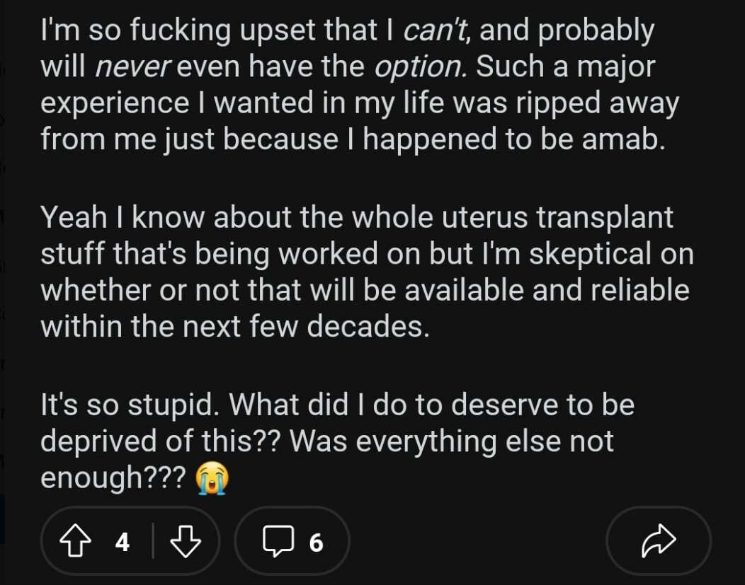 They don't realise that a woman's uterus and ovaries have their own arterial system that men lack. So no, you can't have a fucking uterine transplant. Aside from which your pelvis is too narrow.
