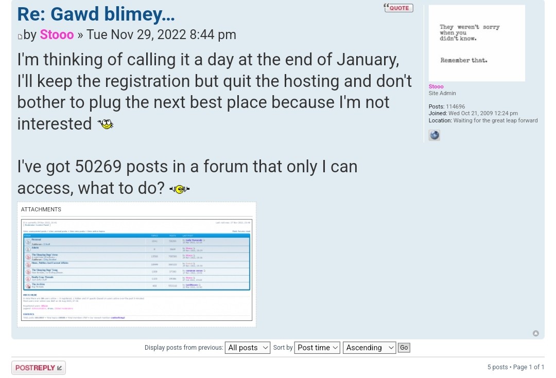 He's been threatening this for years sadly to no avail. The bald truth (no pun intended) is he's ruined his own forum by allowing heavy handed moderation and being an utter twat to posters. Now the place is just boring and anyone who might have kept the place alive got banned. Dogs has definitely run its course. Or perhaps the persona known as Stooo has just had enough and realised theres more to life than acting the cunt on a piddly forum when he can rise Godlike from the ashes at the front of the RM strike queue.