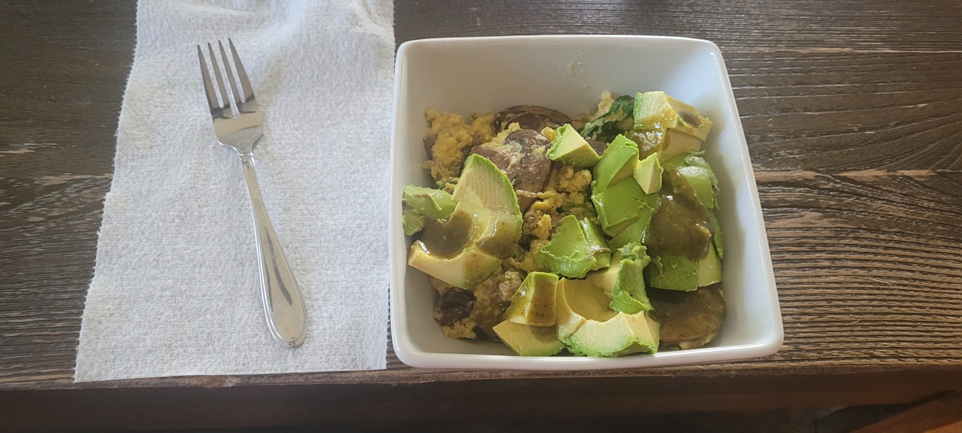 Eggs, mushrooms, spinach, ground beef, cottage cheese, avocado and hot sauce.