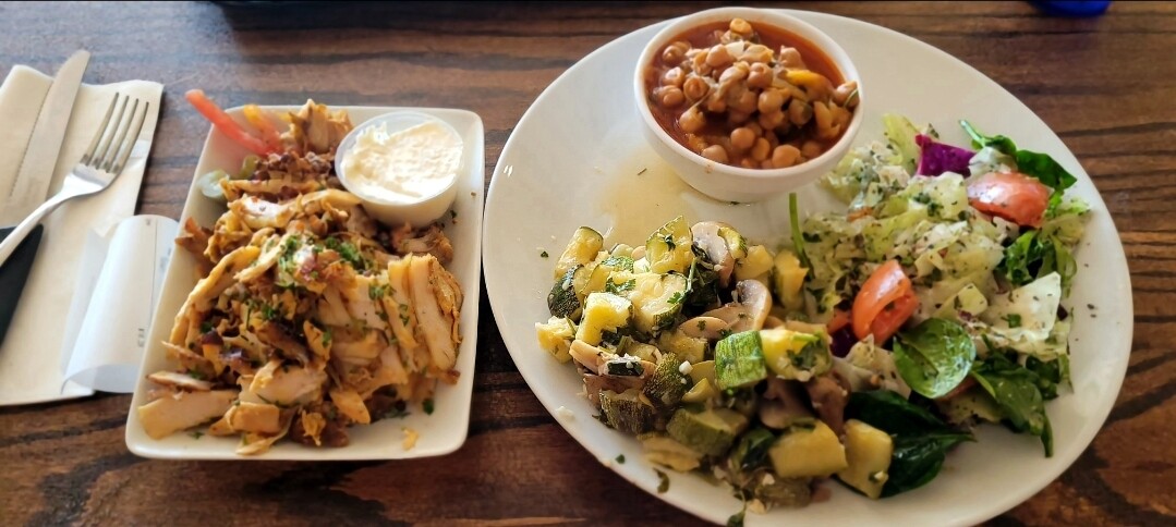 My Mediterranean lunch. Chicken shwarma, spinach and cabbage salad, zucchini and chicken peas with eggplant..