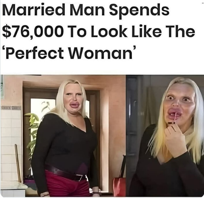 Shows you how loony these dress-up blokes are...this is his idea of what a "perfect" woman looks like. I wonder who the hell he's basing himself off on...has to be one ugly arsed woman, Donatella Versace - what with the lips and "blond" wig.