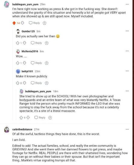 Meghan Markle's visit to the scene of the school shooting hasn't gone down well, seems she turned up with a camera crew. People have compared her visit to Kate's at the vigil for Sarah Everard when Kate turned up without fanfare or her protection officer.