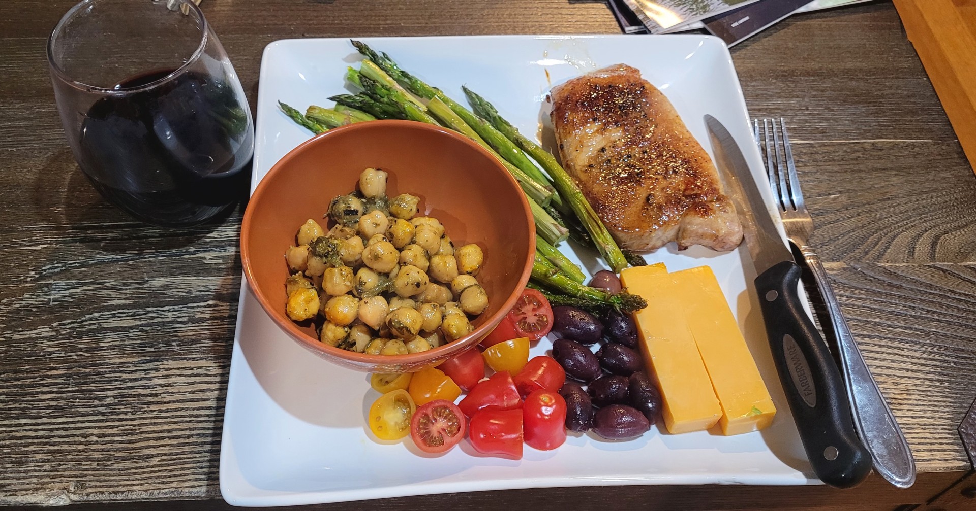 Pork chop, asparagus, chick peas, olives, cheese and maters..