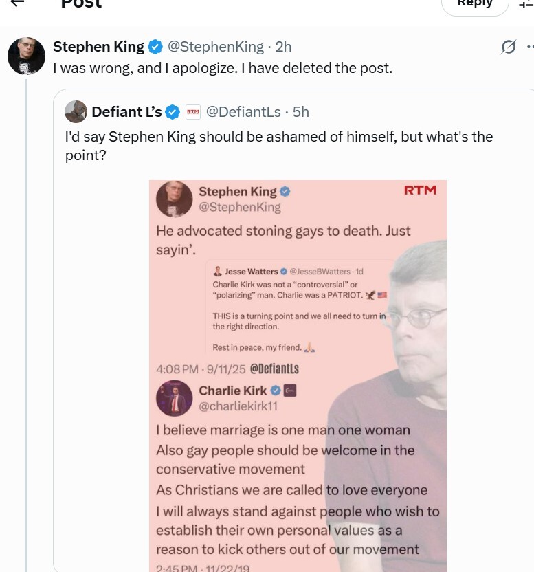 As for Stephen King, a highly influential writer with millions of followers and fans and he posts a complete untruth that he later removes and apologises for. But you know, too fucking late!