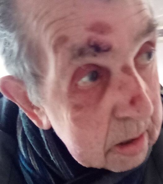 My father has black eyes, a cut on his forehead, cuts on his check and a swollen nose.