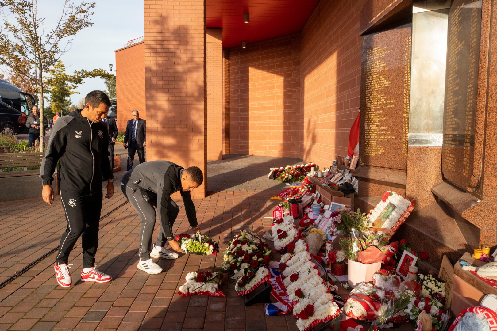 Rangers are playing Liverpool tonight in the Champions League, our manager and Captain laid a wreath at the Hillsbrorough memorial to pay respects to the 97 Liverpool fans who died in the disaster.