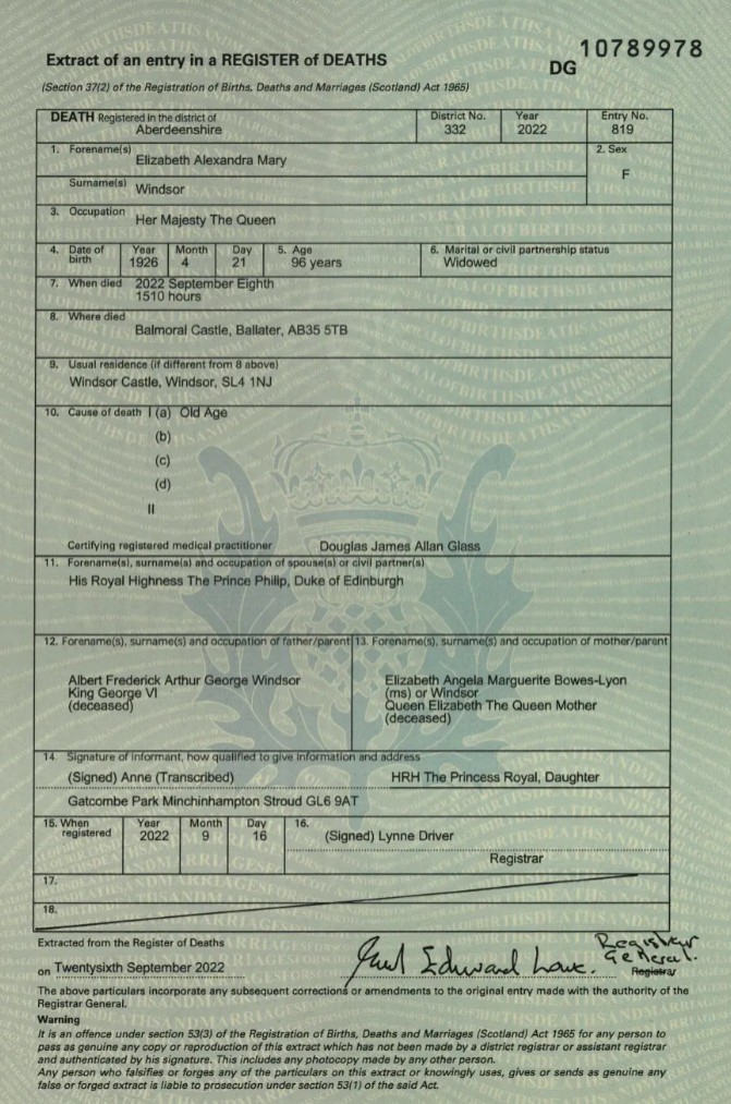 The death of her Majesty was registered in Aberdeen on the 16th of September.