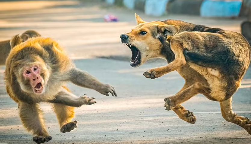 A monkey in India thought it would take a bite out a stray dog.