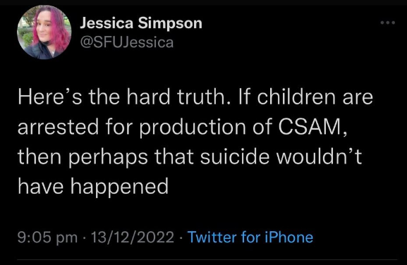 Thinks victims of CSAM ( Child Sexual Abuse Material) should be arrested for making porn.
