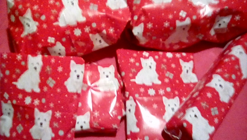 I decided to wrap up some of my Christmas presents, I wrapped up Scrappy Doo's and then got bored. I hope my little cherub likes the Westie wrapping paper.
