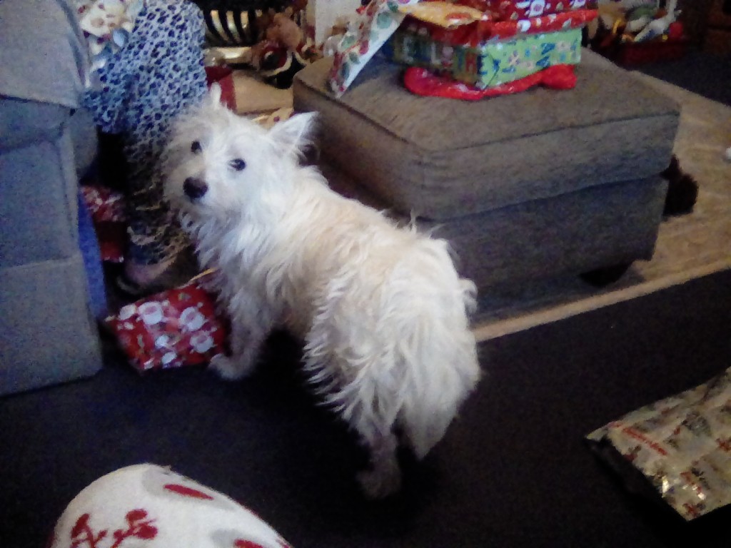 Scrappy Doo keeping a close eye on my mother as she opens her presents.