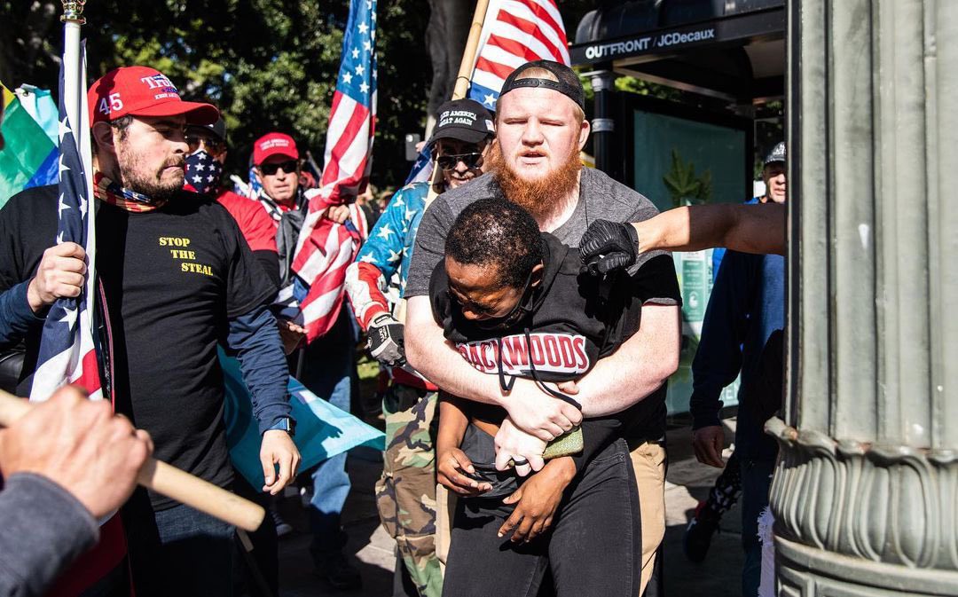 Pictures have captured the moment a white Trump supporter reportedly came to a black woman's aid after an angry mob of MAGA fans attacked her, ripped off her wig, and called her the N-word during a 'Stop the Steal' rally in Los Angeles .