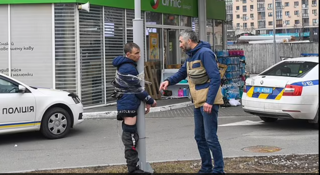 Looter is tied up and humiliated as punishment for trying to steal during Russian attack on Kyiv | Daily Mail Online