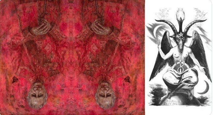 The original mirror image is of a dog, but if you bring the mirror image effect closer to the arms and flip the image upside down, you do indeed get Baphomet. It even has the light above its head.