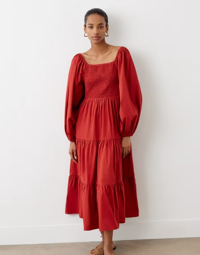What fevered mind thought this delight up? This is what my old mum used to call a Mother Bear dress. Shapeless and unflattering. Look at those Godawful sleeves! She looks deformed.