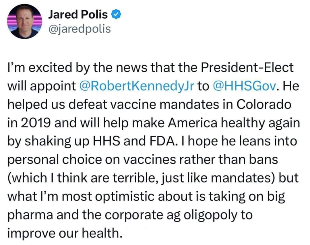 He's not going to stop people from getting vaccines That's just hyperbole. He will require testing, release the results of that testing so people really know what they are getting, and make manufacturers responsible when they harm people.