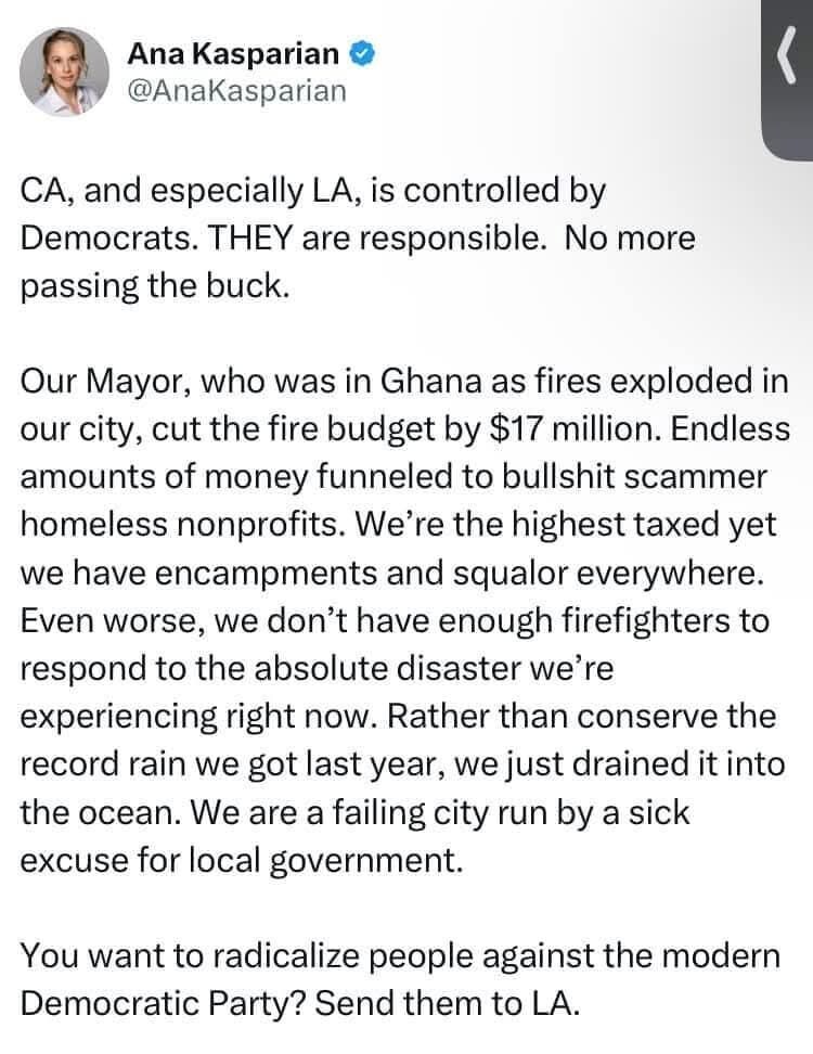 They have no water now to fight it and the winds are preventing aircraft from helping. They were warned about this too and are being accused of spending billions on immigration and climate initiatives but nothing on fire prevention.