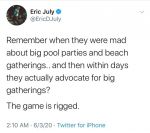 All the effort people have made over the last three months here is being ruined now by selfish bastards partying/holding raves all over, filling the beaches like sardines and now this bandwagon jumping lot.