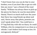 I won't read book, nor anything to do with him, self pitying crybaby. Brings Diana up for pity points, uses his mum. William's her son too, he never uses her memory. I detest him!
