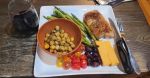 Pork chop, asparagus, chick peas, olives, cheese and maters..