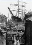 an amazing view through the slum gardens of London's Millwall to the majestic bow of the 3-masted barque 'S.V. Penang', sitting in dry dock at the Isle of Dogs in 1932.