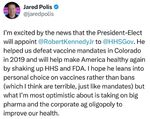 He's not going to stop people from getting vaccines That's just hyperbole. He will require testing, release the results of that testing so people really know what they are getting, and make manufacturers responsible when they harm people.
