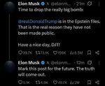 Trump has under estimated Elon big time. I don't have time for Mr Musk at all but the orange sociopath has made no secret of how he views women and if this comes back to haunt, so be it.
